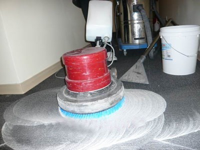 5、干泡刷洗:用装有打泡器、地毯刷的单盘扫地机,以干泡刷洗地毯。等清洁剂对地毯产生作用一会后,在重复刷洗工作。