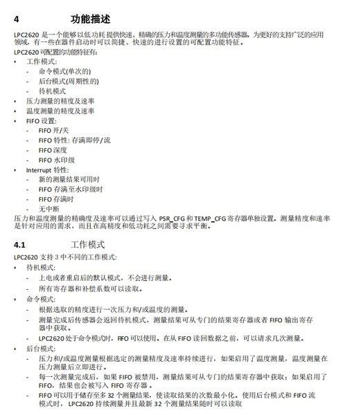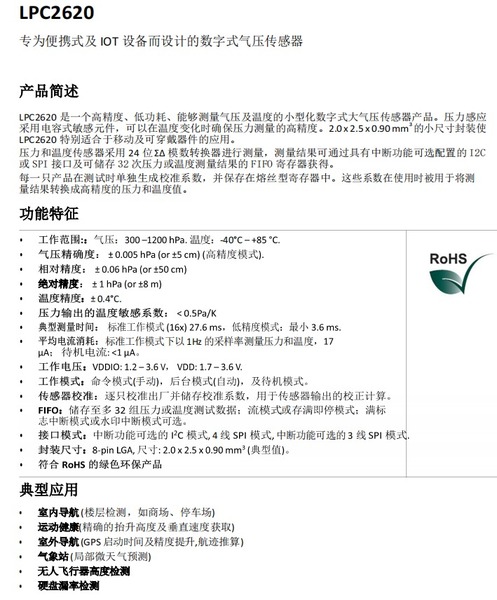 LPC2620 是一个高精度、低功耗、能够测量气压及温度的小型化数字式大气压传感器产品。压力感应