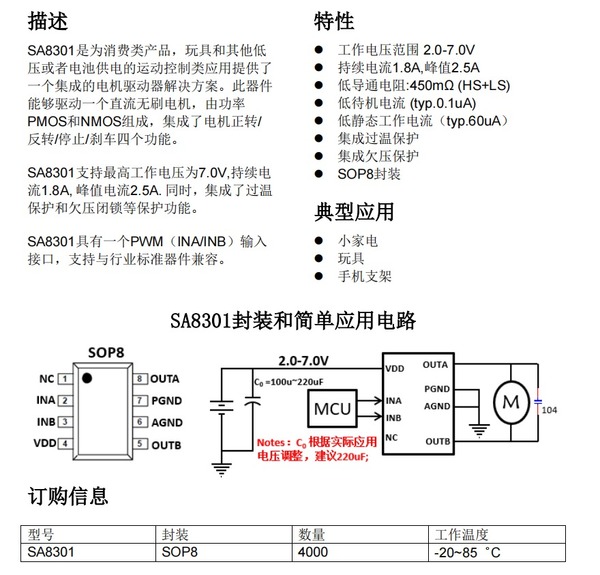 SA8301是为消费类产品,例如玩具和其他低压或者电池供电的运动控制类应用提供了 一个集成的电机驱动器解决方案。此器件能够驱动一个直流无刷电机,由功率 PMOS和NMOS组成,集成了电机正转/ 反转/停止/刹车四个功能。