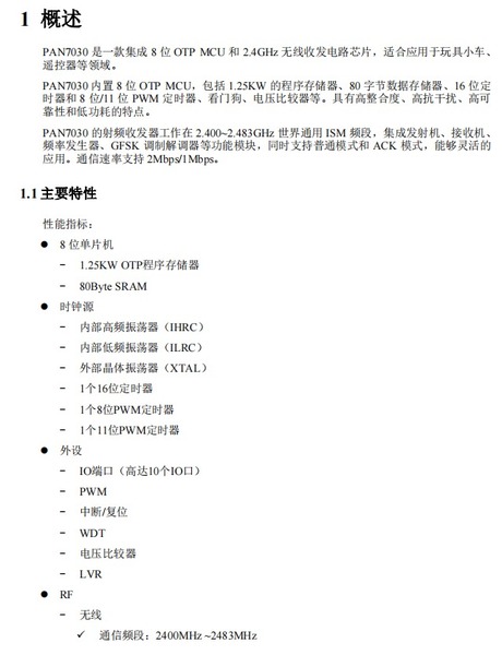PAN7030 是一款集成8位OTP MCU和2.4GHz无线收发电路芯片,适合应用于玩具小车、 遥控器等领域。