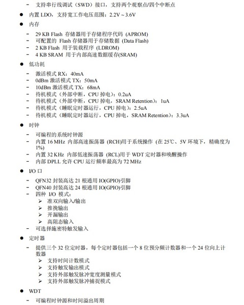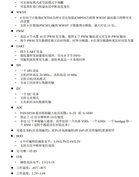 PAN2025具有许多高性能外设功能,例如16 MHz内部RC振荡器(校准后精度为±1%),高达24个GPIO引脚,3个32位定时器,4个UART,1个SPI接口,1个I2C接口,1个8通道的16位PWM发生器,一个8通道12位ADC,看门狗定时器,窗口看门狗定时器,两个模拟比较器和欠压检测器。所有这些外设都已集成到PAN2025中,以减少元件数量,电路板空间和系统成本。