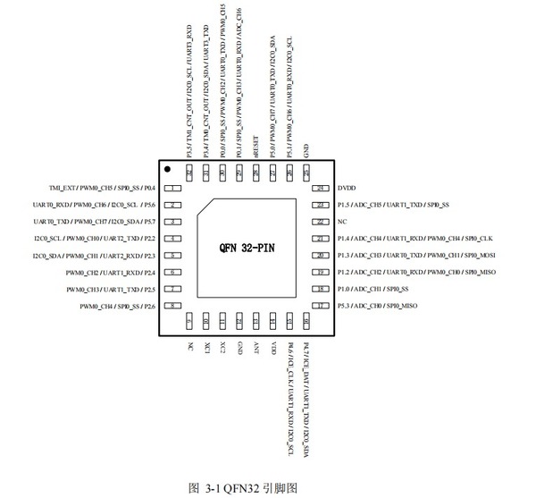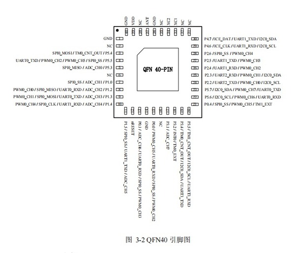 此外,PAN2025还配备了ISP(在系统编程)和ICP(在线编程)功能,允许用户更新程序存储器而无需从实际的最终产品中移出芯片。PAN2025还支持在应用程序编程(IAP)功能,这意味着在嵌入式闪存更新后,用户切换执行代码而无需复位芯片。PAN2025包括了QFN32和QFN40两种封装形式,QFN32封装与PAN163兼容,而QFN40封装与PAN159兼容。