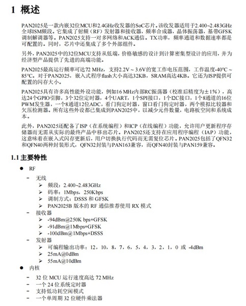 PAN2025是一款内嵌32位MCU和2.4GHz收发器的SoC芯片。该收发器适用于2.400~2.483GHz全球ISM频段。它集成了射频(RF)发射器和接收器,频率合成器,晶体振荡器,基带GFSK调制解调器等。PAN2025支持一对多网络和ACK通信。TX功率,频率通道和数据速率都是可配置的。同时,芯片中还集成了多个外部组件。