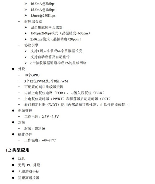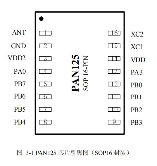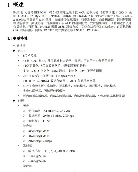 PAN125 为自带 EEPROM,带 2.4G 高速无线 8 位 MCU 的单片机。MCU 内建了 2K×14-bit的 FLASH、128 Byte 的 EEPROM、128Byte 的 SRAM。2.4G 无线收发单元工作在 2.400 ~2.483GHz 世界通用 ISM 频段,集成射频收发通路、频率发生器、晶体振荡器、调制解调器等功能模块,并且支持一对多组网和带 ACK 的通信模式。发射输出功率、工作频道以及通信数据率均可配置。PAN125 采用 GFSK 通信方式,支持自动应答及自动重传,自带扰码和CRC 校验功能。