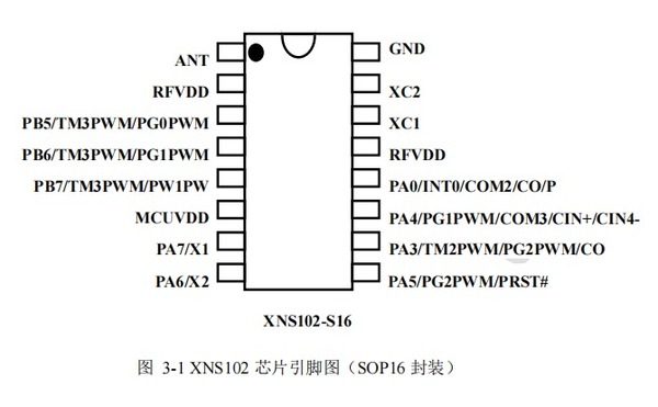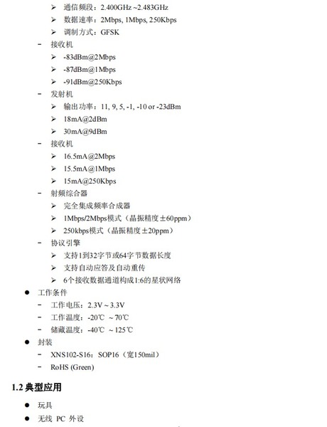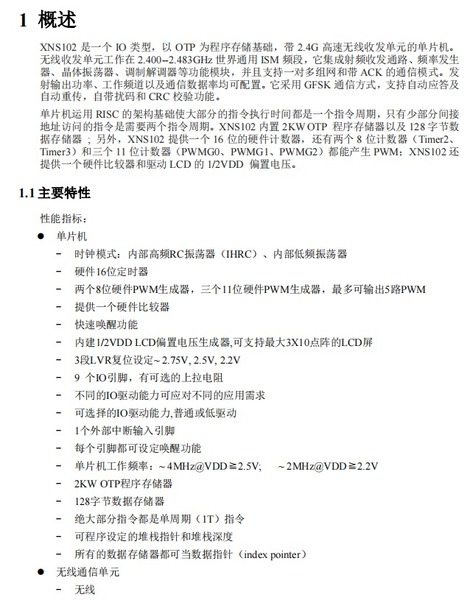 XNS102 是一个 IO 类型,以 OTP 为程序存储基础,带 2.4G 高速无线收发单元的单片机。无线收发单元工作在 2.400--2.483GHz 世界通用 ISM 频段,它集成射频收发通路、频率发生器、晶体振荡器、调制解调器等功能模块,并且支持一对多组网和带 ACK 的通信模式。发射输出功率、工作频道以及通信数据率均可配置。它采用 GFSK 通信方式,支持自动应答及自动重传,自带扰码和 CRC 校验功能。