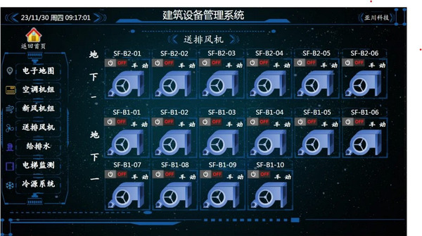 通排风机检测风机实际电功率,风机和防火阔设置连锁启动,通过间歇运行、局部排风和地库CO浓度由控制器自动控制风机的节能运行。