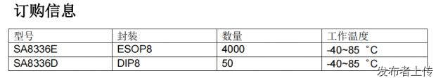 SA8336内置温度保护功能,当芯片温度超过内部温度保护电路设置得最高温度点后,内部电路关断内置的功率开关管,切断负载电流。