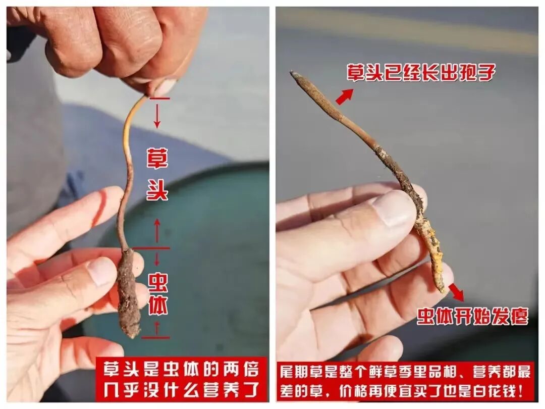 ②是因为咱杂多鲜草季只有一个月的时间,现在已经到尾期阶段了,挖到的虫草草头特别长,都开出孢子了,品相差,营养也极低,这样的草我们坚决不做,不能让大家花高海拔虫草的钱,买差草!