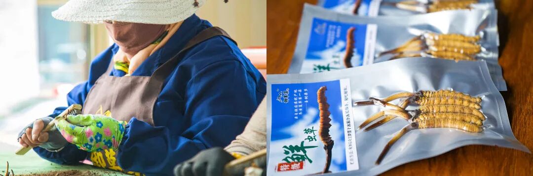 虽然产量少,但品质一点也不能松懈,每一根都必须是百里挑一!先来品品外观,师傅们收来的全都是这种草把子短小、虫体饱满、金灿灿的头茬好虫草!